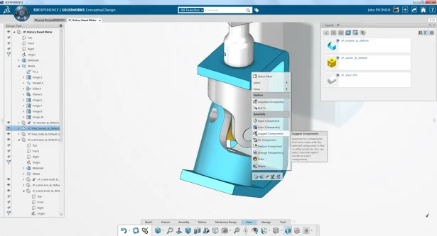 Additionally, SOLIDWORKS Conceptual Design can suggest which components have been mated together previously. No manual searching is required, just right mouse click on a component and the software will provide a list of previously mate components for you to choose from.