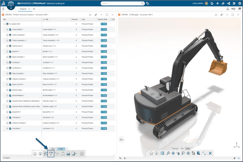 例えば、選択的読み込み機能がない場合、設計チームが掘削機に取り組んでいたとします。1人が油圧を担当し、もう1人がエンジンやキャビンの内装設計を担当している場合、それぞれで掘削機全体を読み込む必要があります。これは時間がかかり、読み込みが完了するとシステムのリソースを大量に消費する可能性があります。選択的ロード機能を使用すると、フィルターを作成して、ローディングするデータを定義できます。掘削機で作業している全員が、リアルタイムで発生するすべての変更を確認できます。表示したいセクションに適用されるフィルターを使用して必要なローディングデータを定義できるため、パフォーマンスが大幅に向上します。