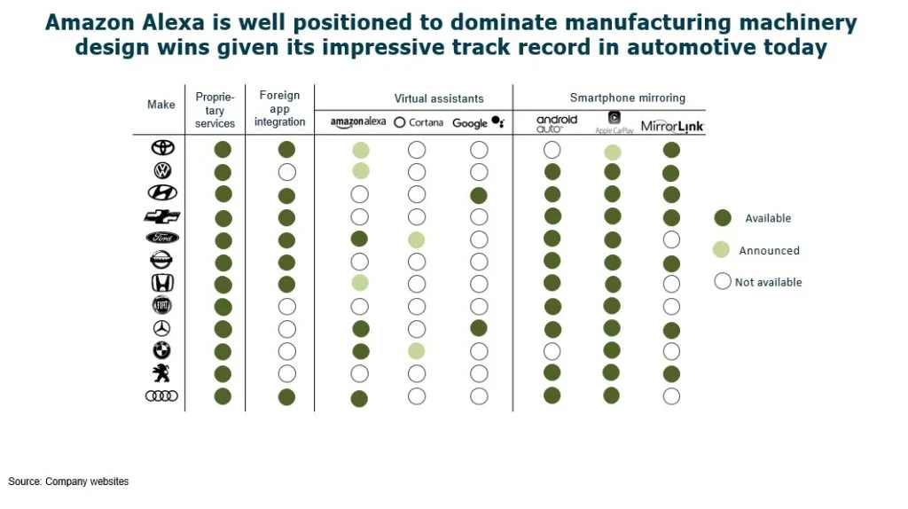 1. Virtual agents have the potential to redefine many areas of manufacturing operations, from pick-by-voice systems to advanced diagnostics. Apple’s Siri, Amazon’s Alexa, Google Voice, and Microsoft Cortana have the potential to be modified to streamline operations tasks and processes, bringing contextual guidance and direction to complex tasks. An example of one task virtual agents are being used for today is guiding production workers to select from the correct product bin as required by the Bill of Materials. Machinery manufacturers are piloting voice agents that can provide detailed work instructions that streamline configure-to-order and engineer-to-order production. Amazon has successfully partnered with automotive manufacturers and has the most design wins as of today. They could easily replicate this success with machinery manufacturers.
