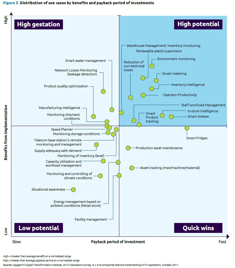 1. Design in the Internet of Things (IoT) support at the data structure level to realize quick wins as data collection pilots go live and scale. ERP platforms have the potential to capitalize on the massive data stream IoT devices are generating today by designing in support at the data structure level first. Providing IoT-based data to AI and machine learning apps continually will bridge the intelligence gap many companies face today as they pursue new business models. Capgemini has provided an analysis of IoT use cases shown below, highlighting how production asset maintenance and asset tracking are quick wins waiting to happen. ERP platforms can accelerate them by designing in IoT support.