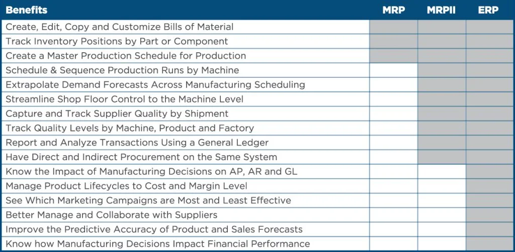 The chart below compares the different functionality of MRP, MRP II, and ERP: