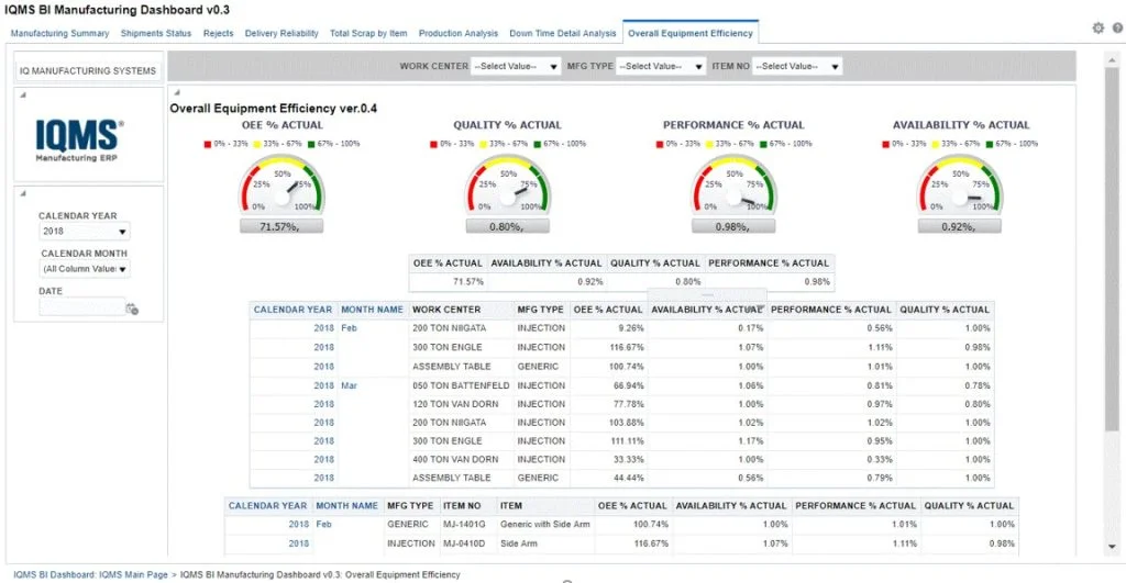 OEE is becoming the metric of choice for production engineering, manufacturing production management, operations management and senior management teams who want to know how each machine’s availability, performance, and quality impacts growth. Mobile ERP apps built on a single database architecture as IQMS’ flagship suite EnterpriseIQ Version 16 is providing real-time data from every machine on a production line. At IQMS we’re going a step further and providing time series results by the calendar year and month, which is invaluable for finding trends in each OEE component’s value over time. An example of a customer IQMS dashboard providing real-time OEE results is shown below.