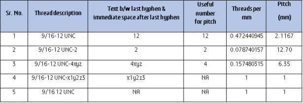 In our current example, the numeric text is 12. This number is considered as threads per unit. Since the unit for thread is inch, we divide 12 by 25.4 and use 0.472440945 as the threads per mm. Inverse of this number is used as the pitch. So, for this example, the pitch would be 2.1167mm.