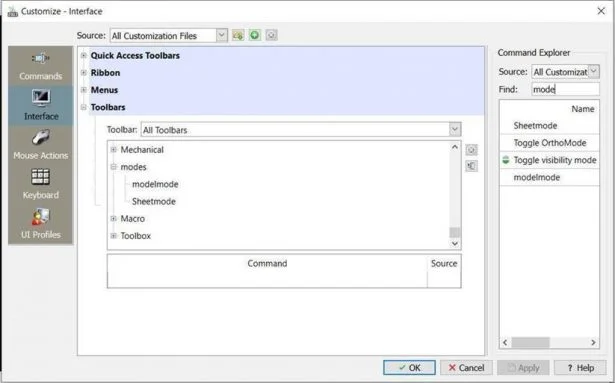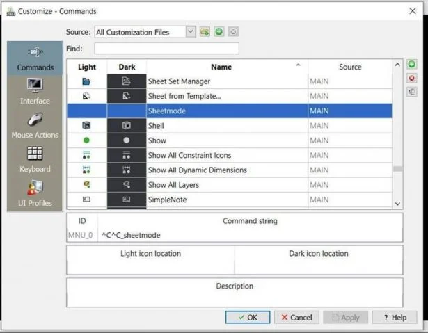 After creating custom commands, using command macro we will create toolbars buttons for easy and quick access to this custom commands. Below are custom command strings for Sheetmode and Modelmode