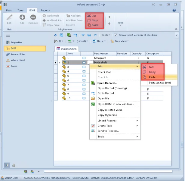 In SOLIDWORKS Manage users can now cut or copy and paste the BOM items from any record to any other record if the new parent record is checked out. The new clipboard commands are available via the ribbon and the context (right-click) menu, as seen in the illustration below.