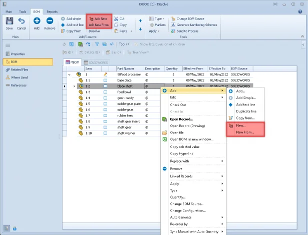 These new commands allow you to feature new items directly from a BOM view, without the necessity to navigate to different windows or maybe closing the present BOM. Click ‘Add New’ and use the ‘Add New’ dialog box to add a new item to a BOM. If you have permission, you can select records from multiple objects. Click ‘Add New From’ and use the ‘Add New From’ dialog box to add a new item using the selected item as the source record. This is similar to the ‘New From’ function available in other areas. This saves time and effort. These options are available on the ribbon bar and the context menu.