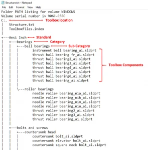 How to extract SOLIDWORKS Toolbox components tree in single text file?