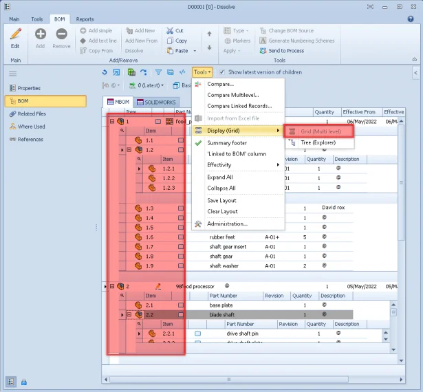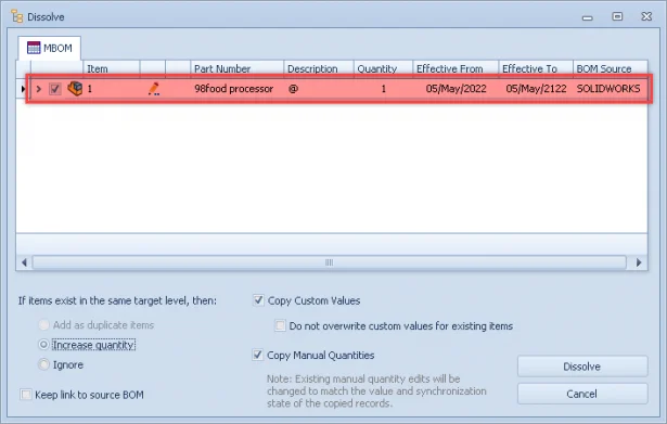 ‘Dissolve’ is one of the foremost powerful enhancements to dissolve an item in a BOM, it removes parent sub-structures and promotes their child items into the current level that is under an editing state.