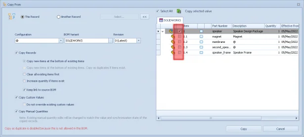 • This option provides the functionality to copy Custom BOM values from another BOM. If you want to prevent overwriting existing values, select this additional option.