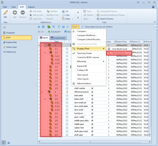 A BOM can be Displayed as a Grid (Multi-Level) or a Tree (Explorer) style. Additionally, in Manage 2021, the BOM items can be exported in Tree Style.