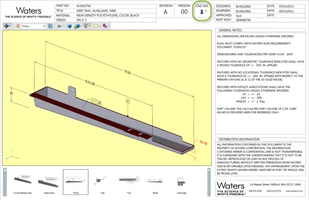Now how to send all necessary files together? Here is a nice trick to assemble multiple files into one PDF package using Adobe Reader. That’s right, just the free Reader, you don’t need Adobe Acrobat to attach files to a PDF. An even better tip, as shared by Tim from Waters Corp., is to customize the 3D PDF layout to specifically call out a section for CAD file attachment shown in the image below.