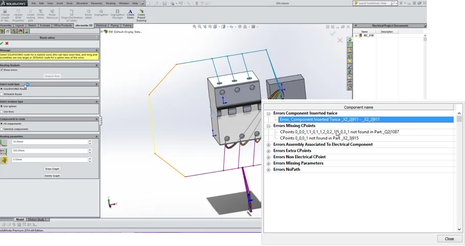 Design electric components in 3D. Engineers tasked with routing complex cables, harnesses and wires in any size assembly know how hard it is to do in 2D. SOLIDWORKS Electrical’s Dynamic Connector tools simplify the design and use of connectors, and new in-line 3D Routing Diagnostics tools identify and resolve routing issues, another huge time saver.