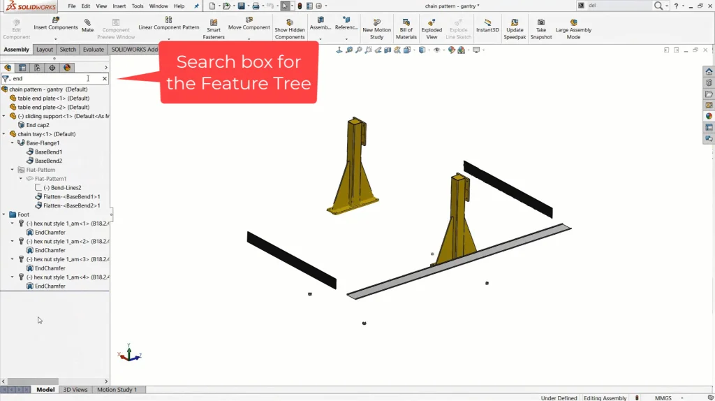 You can organize with folders, and even rename features. Doing this will enable you to leverage one of its most powerful functions, the search function. At the top of the FeatureManager Design Tree (shortened to Feature Tree) there is a search bar that automatically filters the tree as you type.