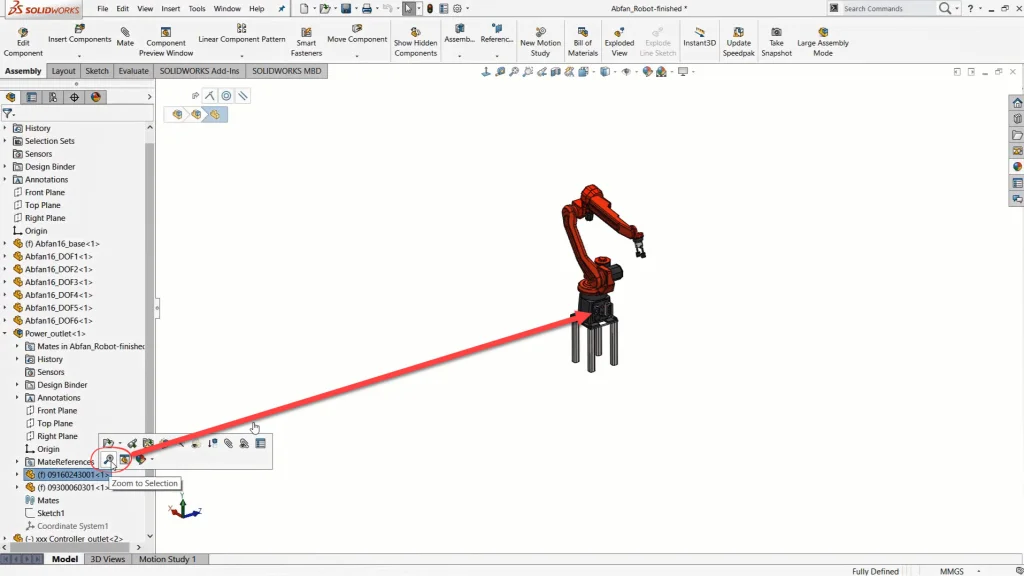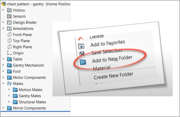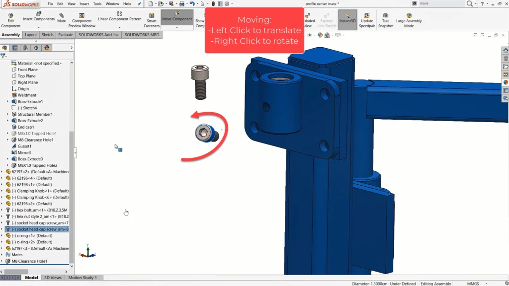 As you’re building an assembly, you’ll move components around the graphics area to help get them locked into place using mates. It’s obvious to most users that clicking and holding the left mouse button on a component allows you to drag it around. But many may not be aware that the same click-and-drag with the right mouse button allows you to rotate a component in place. This really streamlines the process of prepositioning a component in an assembly so that it’s ready to be mated in place.