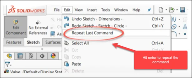 It’s not doing something once, but doing it over and over again that really racks up the time. To save some of that time, you can use the Enter key to quickly launch the last command. Think of this as a hot key that gets automatically mapped to the last thing you were doing. This works for things like sketching, features or assemblies.
