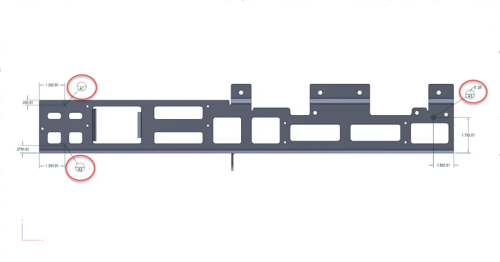 Another MBD enhancement in 2021 is the addition of Datum Targets for GD&T dimensioning. A Datum Target is a line, point or a defined zone on a target with which used in order to establish a Datum plane. In our example of the sheet metal part shown on the PDF above the flat face of the part could be warped or bent a small amount on a local area. That defect could possibly throw off the inspection process enough to reject the part as unusable. If Datum Targets are used to define a plane based on 3 points on the face of the part then that plane is used for inspection purposes. Here’s what the Datum Targets look like when applied to the sheet metal part. The Targets on the left are point targets and on the right a defined circular zone of a 0.25 inch in diameter. The targets are located using dimensions and honor the dimensioning standard set in Document Properties.