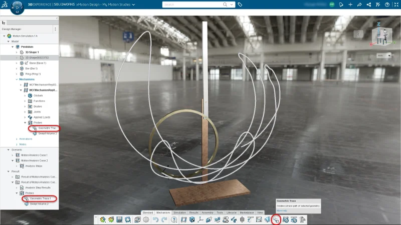 How it works: let’s say you are studying the movement of a pendulum, and you want to get the trace path of certain points on the component, the tool will trace the geometry of the component while it’s in motion and automatically generate the sketch. For instance, in the image below, you can use the points to create a sketch based on those points. The sketch can then be reused for design purposes and other use cases.