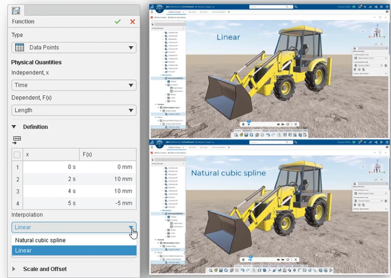 In addition to the existing Natural Cubic Spline functionality, you can also choose from the Linear option under the Functions command to see the behaviors of a linear interpolation. This enables you to see how your product will operate at different times when it’s in motion.