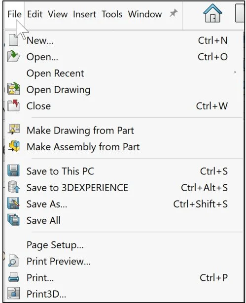 Click File from the SOLIDWORKS Main menu. View the save options.
