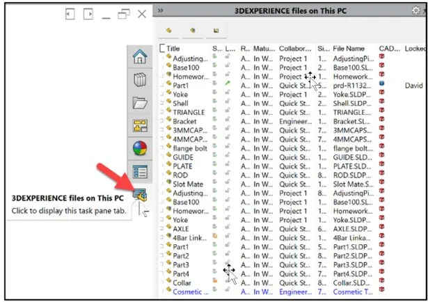Click the 3DEXPERIENCE files on This PC icon in the Task Pane. View the saved files in the 3DEXPERIENCE platform and their Collaborative space locations. Below is an example of the files on my SOLIDWORKS desktop.