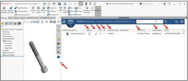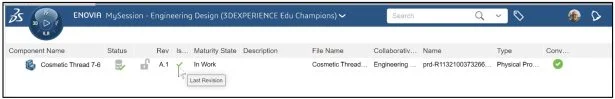 View the columns in the MySession panel: Component Name (Cosmetic Thread 7-6), Status (Saved to the platform), Locked Status (Unlocked), Rev (A.1), Is Last Revision (Yes), Maturity State (In Work), File Name (Cosmetic Thread 7-6), Collaborative space (Engineering Design), Name (prd-R1132100037266), Type (Physical Product), Convert status (Yes). Note: A Physical Product is a configuration of a part or assembly that can be manufactured. When you save a .sldprt or .sldasm file to a Collaborative space, each configuration becomes a Physical Product with a name that you can find in searches.