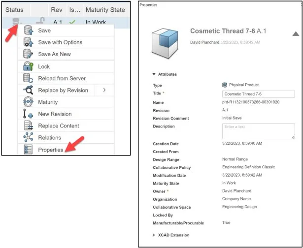 Review and address numerous Save options: Save to this PC, Save to 3DEXPERIENCE, Save Active Window, Save with Options, etc. View several Product Lifecycle Management (PLM) attributes of the part.