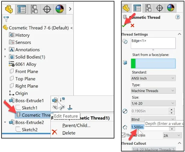 Click Edit Feature from the Pop-up menu. The Cosmetic Thread PropertyManager is displayed.