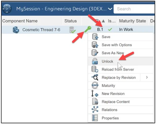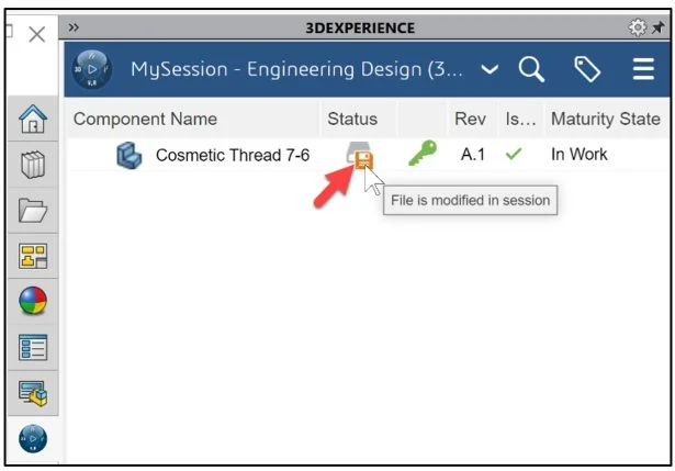 The MySession panel displays the Component Name, Status (Displays an icon that represents the status of a given revision, saved or not saved to the platform), Locked status (Locked or Unlocked), Rev (Revision #), Is Last Revision (Yes/No), Maturity State (Lifecycle state of the family, for example: Private, In Work, Frozen, Released, Obsolete), Description, File Name (Displays the PLM external ID of the object for reference objects and the PLM external ID of the connection for instances) and Type (Physical Product or Drawing).