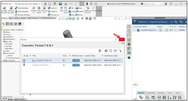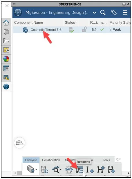 View the Revisions dialog box. The box displays the history revision information on the document. Revision A.1 and B.1 are displayed. Maturity State: In Work. Creation and Modification Dates are displayed. Close the Revisions dialog box.