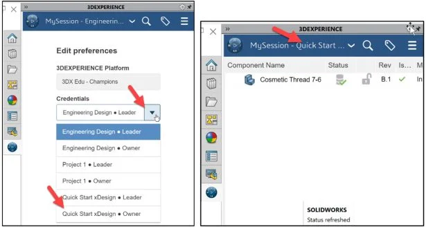 Click the 3DEXPERIENCE icon in the Task Pane. The MySession panel is displayed. This displays the two-way communication between SOLIDWORKS running on your machine and the 3DEXPERIENCE platform running in the cloud. Experience a single modeling environment.
