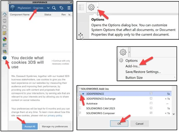 Note: If you do not see the 3DEXPERIENCE icon, click the Options drop-down arrow, click Add-Ins, check the 3DEXPERIENCE box, click OK, from the SOLIDWORKS Main menu.