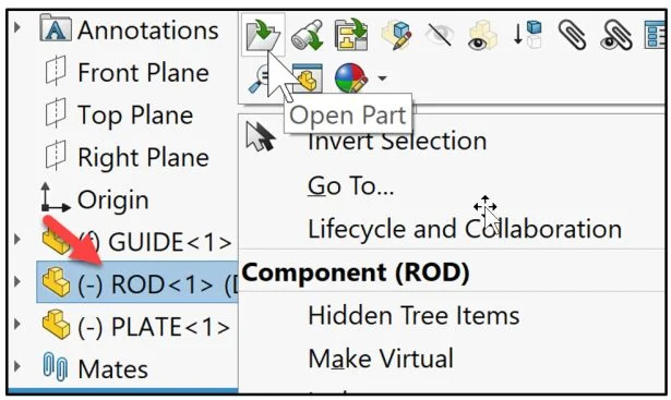 Modify the length of the ROD from 100mm to 105mm. Lock the component. This prevents anyone in your Collaborative space from making a modification to the component while you are working on it.