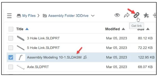 Assembly Modeling 10-1 is selected. Create a link to the assembly for someone outside of your Collaborative space.