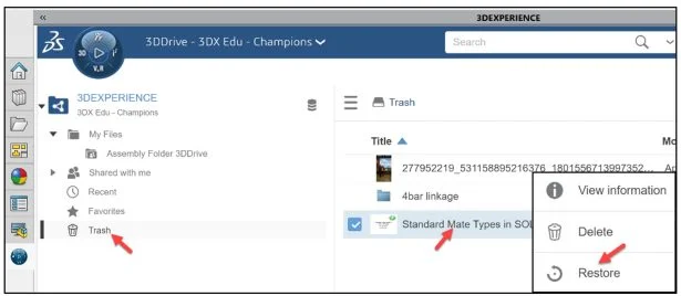 View the 3DDashboard for 3DDrive on the platform. Whatever you upload or save to 3DDrive will be stored in the “My Files” folder, and whatever is shared with you by others in a different 3DDrive will be stored in the “Shared with me” folder. Anything you discard will end up in the trash bin awaiting a final deletion. This gives you a second chance to consider whether you really want to delete a file.