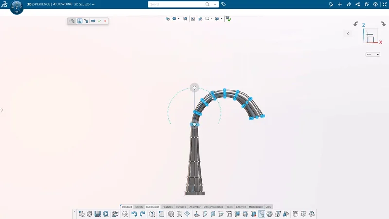 The Arc Bend function lets you bend the end mesh points on a subdivision object in an arc. You do this by first selecting Arc Bend from the action bar and then selecting a plane in which the bend will occur—sort of like selecting a plane for sketching.