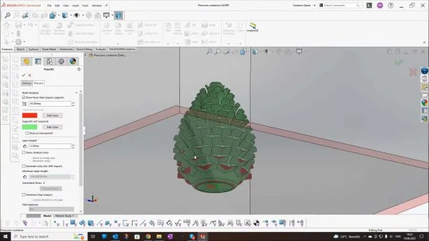 All printers have different properties. Within the Print3D tool in SOLIDWORKS, you can input your printer’s degree of acceptable overhang to evaluate which faces on your 3D model will require support when printed – as seen here in Danute’s example.