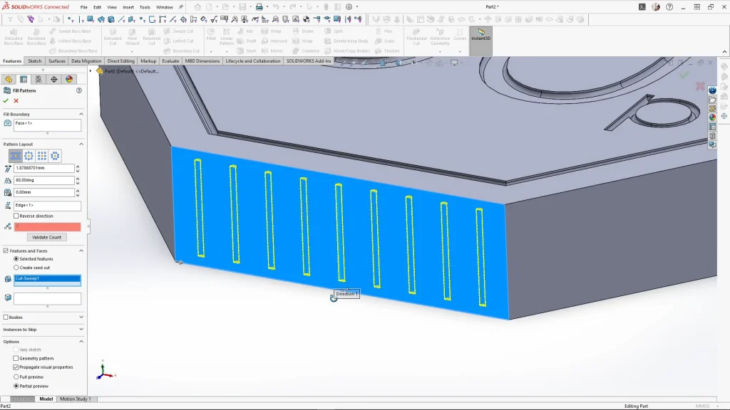 The back featured another DXF sketch, rotated and positioned precisely before cutting. Small fillets of 0.2mm softened the text and face details. Edge textures were trickier than the round coin: I sketched a short line, used a 0.3mm circular profile for a sweep cut, applied a fill pattern with 1.5mm spacing, and then used a vertical line as the axis for a circular pattern with seven instances to match the coin’s sides. A 2mm fillet on the seven outer edges finished it off.
