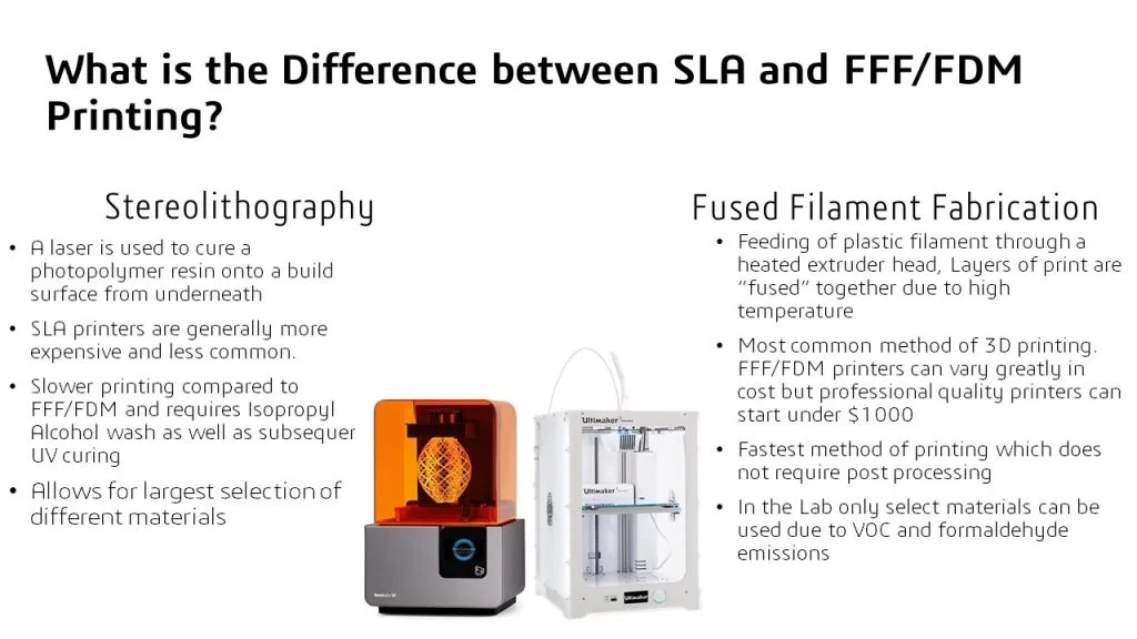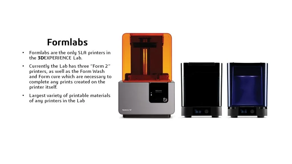 The only SLA printers we currently use within the Lab are the Formlabs Form2 printers. Because they are SLA the Formlabs are able to print with the highest quality (and least noticeable layer heights) of any of the printers in the lab. We use the Formlabs when we encounter projects with specific printing requirements that FFF printers are unable to accomplish.
