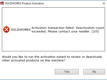 If you find yourself in a situation where you are unsure what computer the license is active on, please contact your VAR, and they should be able to help you. If your old computer has crashed, and you have no way of opening your old SOLIDWORKS, you should also contact your VAR and they will be able to help you deactivate your license. To have your VAR deactivate your license should only be done as a last resort, as you will not be able to activate the license on the computer again.  This leads us to the next error message.