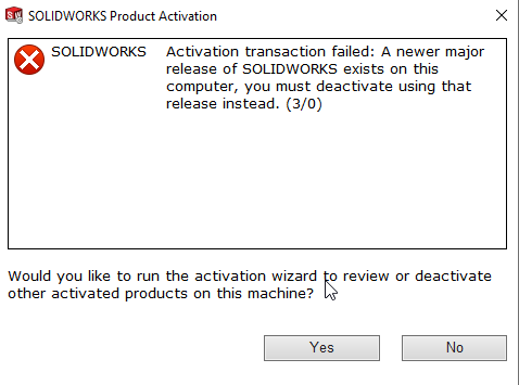 If you have two versions of SOLIDWORKS installed you must deactivate the newest version first.