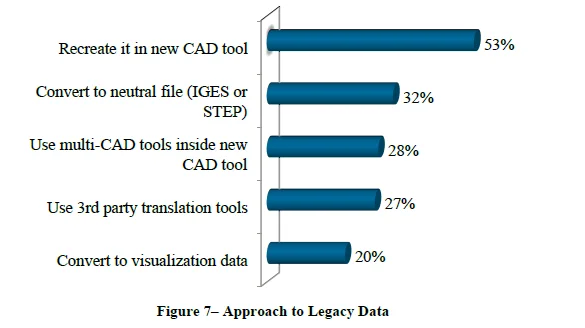 Once you have determined what data you would like to convert, the next decision is how to much accomplish this. Despite the advancements to support multi-CAD data, by far, the most common approach to legacy data is recreating it. Over half of respondents (53 percent) recreate their design data in the new CAD tool.