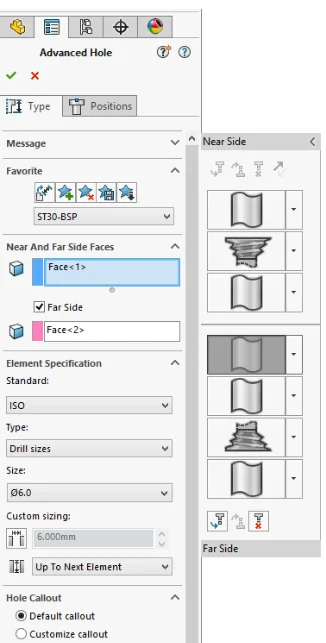 You can access Advanced Hole from the Features toolbar, or by Insert > Features > Advanced Hole. The PropertyManager opens with the Near Side flyout displayed. You can then define a series of hole features that can be built from the Near or Far sides of the part. Finally, like Hole Wizard, use the Positioning tab to locate the hole.