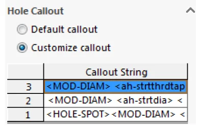 Modified strings are marked with an asterisk in the list. To restore the default settings for individual Callout String items, right-click a string and click Restore Default String. To remove all customizations, under Hole Callout, click Default callout.