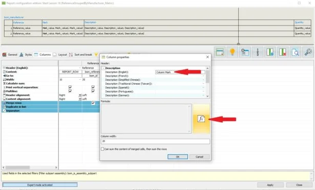 If your new SQL query worked then you should see a new column with the variable we just added and it’s values, we can just hit OK then close to accept. Now let’s add a column to the BOM, We’ll fill in the required Description (BOM column Header). Once the details have been filled, click the formula “fx” button.