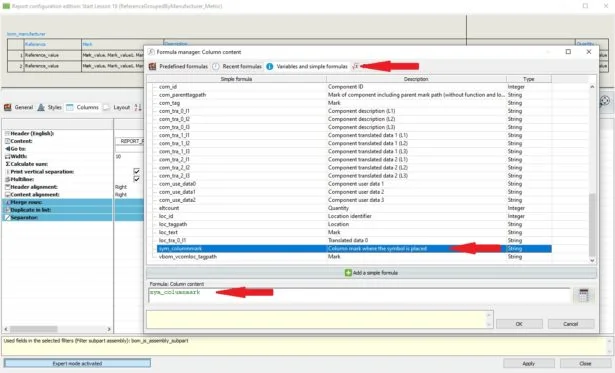 This will open the Formula manager. Select “Variables and simple function” tab and locate our newly created sym_columnmark, followed by “Add a simple formula” (alternatively, you can double click on the formula to add it). Hit OK to close the window.