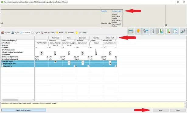 By rearranging the columns and bringing up our Location and adding breaks, we will have successfully made the changes for our BOM to be grouped by Location. You may first check the preview if this is what you wanted, if you are happy with it, just hit Apply and then Close.