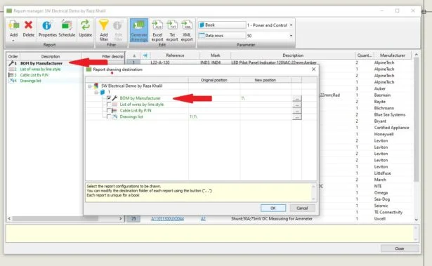 Another window will pop-up “Report drawing destination”, ensure we have selected the Bill of Materials grouped by Manufacturer and hit OK. Once done, close the Report Manager window.