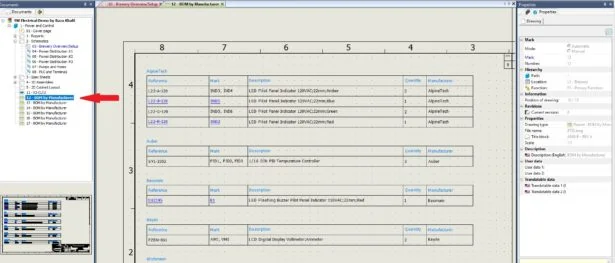 We should now see the newly generated documents, including Bill of Materials under our Document Tree. In the BOM, each manufacturer will be alphabetically listed with their components. There are numerous columns including Quantity and Location.