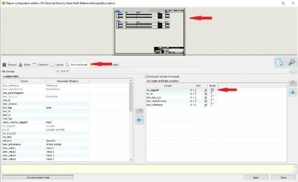 The Sort and break tab is where we want to go now. Here, you can decide how you want to group your BOM by selection of breaks and sorting the order of the Columns. By default, it would have the BOM manufacturer on top with a break. Rearrange the order and bring our Location above with breaks.