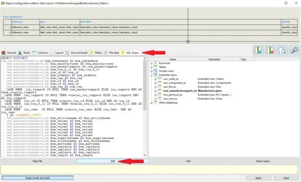 As soon as you enable the Expert mode, you will see a new tab named SQL Query, within it you will see our SQL query on the left panel and the available options you can reference on the right panel. To make any changes though, you need to click on Edit.